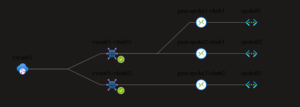 On connecte de la même manière spoke02 à vwan01-vhub01 et spoke03 à vwan01-vhub02.