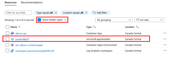 - Une ressource cachée microsoft.app/builders pour l’image générée par Buildpacks.