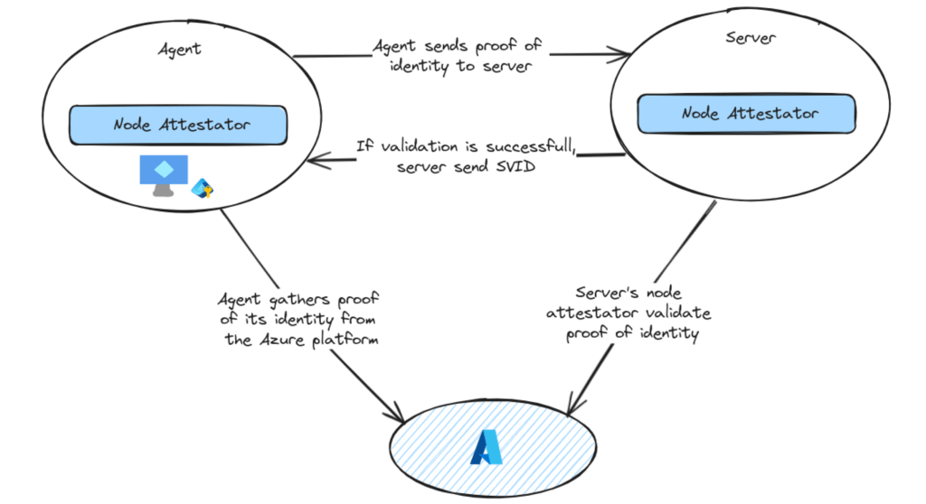 SPIRE effectue une attestation du workload en recueillant des attributs provenant du workload ainsi que du nœud sur lequel l’agent SPIRE est déployé. Cette attestation est réalisée par des éléments logiciels appelés attestators. Dans le cadre de Kubernetes, il existe un Kubernetes attestator et un node attestator de l’agent SPIRE. Sur Azure, le node attestator repose sur les identités managées associées aux Vms (machines virtuelles).