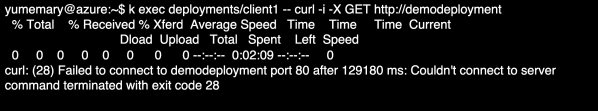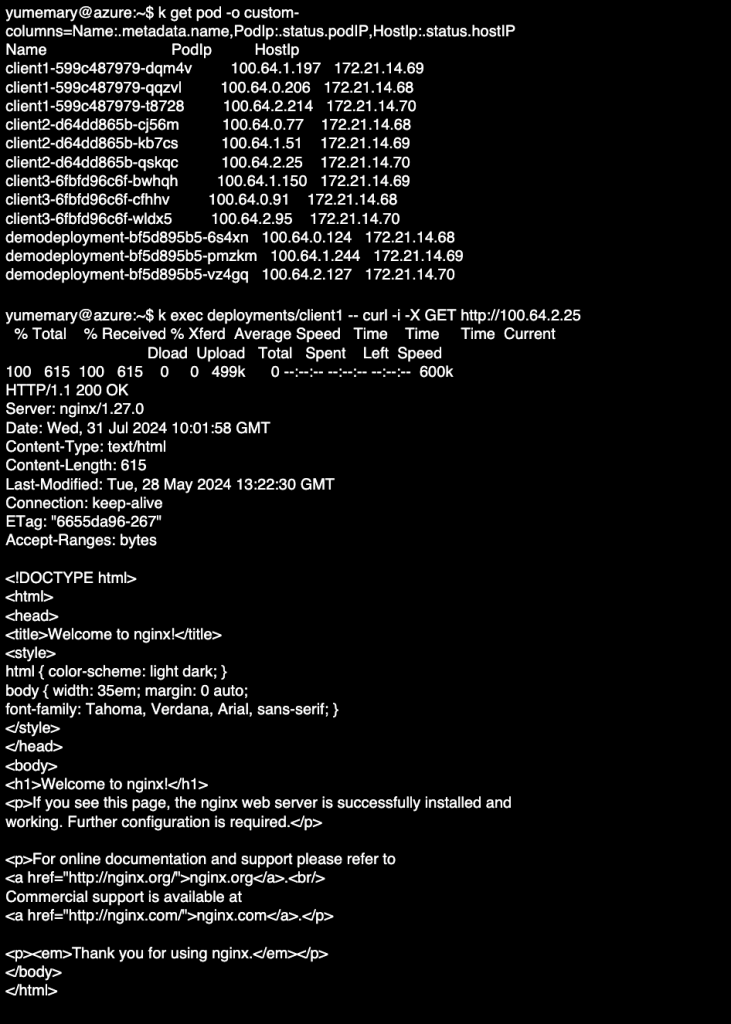 Hubble indique une étape d’authentification entre client2 et demodeployment. Une légère latence est également observée avant l’affichage de la page avec curl, caractéristique de l’étape d’authentification.