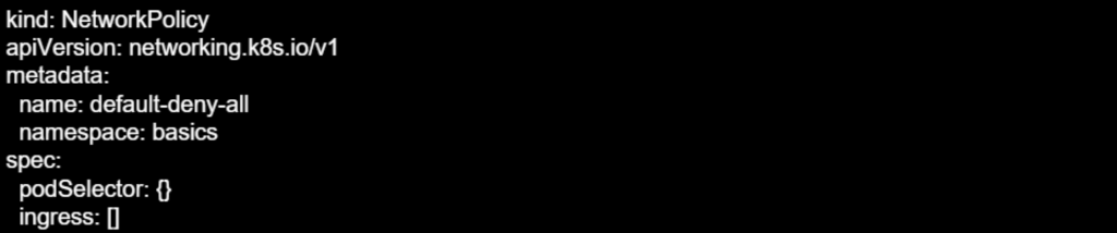 Pour ce faire, il est possible de s’appuyer sur des Network Policies. Par exemple, une Network Policy « Deny All Ingress » appliquée à un namespace :