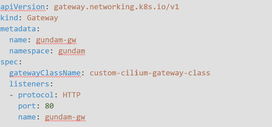 Puisque nous sommes sur un cluster single-node, nous nous appuyons sur la gateway-class-config pour faire de notre Service sous-jacent à la Gateway un NodePort.