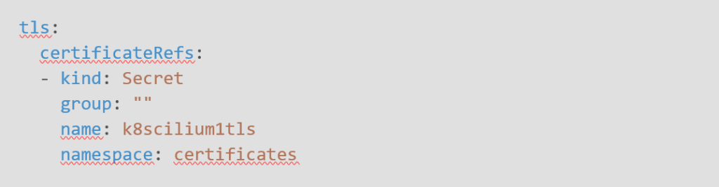 Référencer le Secret de cette manière implique que celui-ci est dans le même namespace que la Gateway, comme indiqué dans l’extrait de la documentation ci-après.
