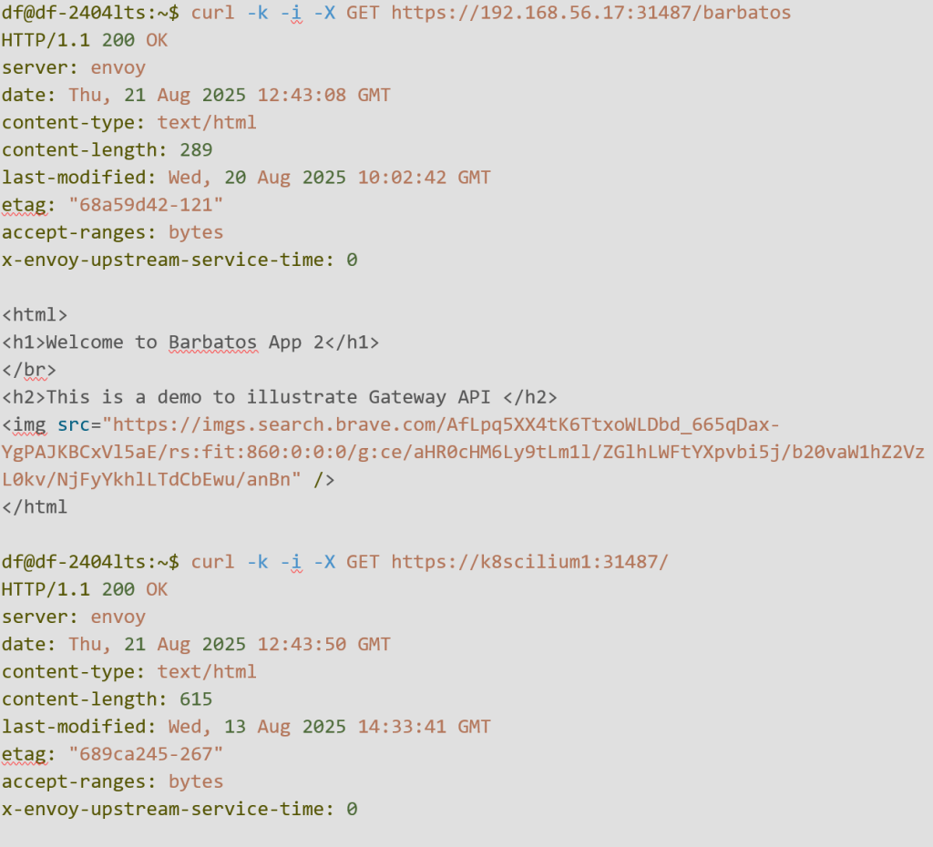 Une commande curl nous permettra à présent d’atteindre avec succès nos applications exposées derrière notre nouvelle Gateway partagée, avec un certificat référencé dans un Secret.