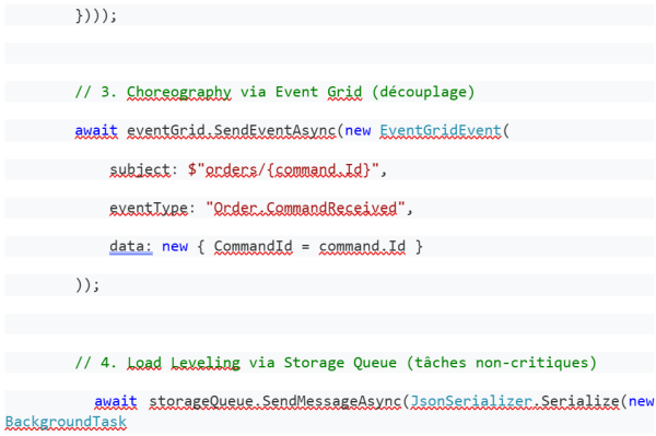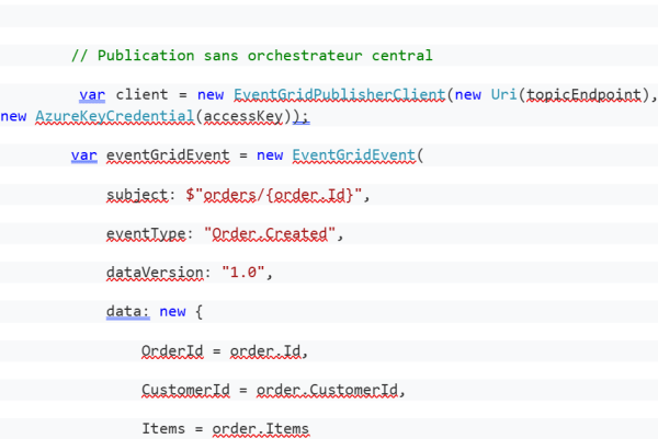 Event Grid m’a fasciné par sa capacité à implémenter élégamment le pattern Choreography. Contrairement à l’orchestration centralisée, chaque service réagit de manière autonome aux événements, créant une architecture résiliente et découplée.