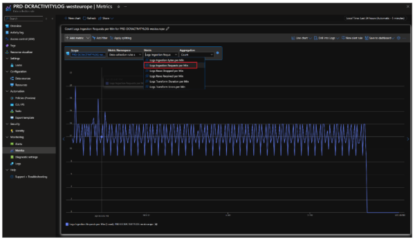 Maintenant qu’on comprend un peu mieux le modèle de facturation, le plus simple est de prendre un cas concret et extrapoler. À titre de cela, un projet personnel qui produit entre 10 et 14 métriques toutes les 3 minutes, soit un peu plus de 3500 métriques produites par jour, soit un total de 100 000 métriques par mois. Cette mesure a été réalisée au niveau de la Data Collection Rule (DCR) en observant le métrique « Log Ingestion Request » comme illustré ci-dessous :