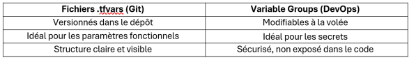 En parallèle des fichiers .tfvars, les Variable Groups d’Azure DevOps permettent de gérer les paramètres et secrets directement depuis l’interface DevOps, sans modifier le code Git.