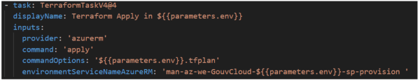 Dans le fichier stage.yml, chaque étape clé du processus comme le plan ou l’apply est définie comme un stage distinct. Cette approche permet d’appliquer des politiques spécifiques à chaque étape (comme des approbations ou des délais d’attente), de mieux isoler et traiter les erreurs, et d’obtenir une pipeline plus modulaire, lisible et maintenable.